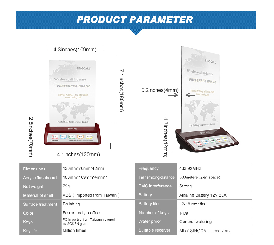 01. Five keys to call, Order, Water, Service, Bill and Cancel. Match to all of SINGCALL receiver.