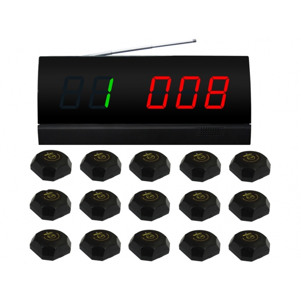 Wireless fluid system is widely used in the service area. It includes the buttons for guests to use and the signal receiver for waiters to use. When the guest is in need, he or she just presses the button near him or her, his or her desk number will be displayed with music or vibration.